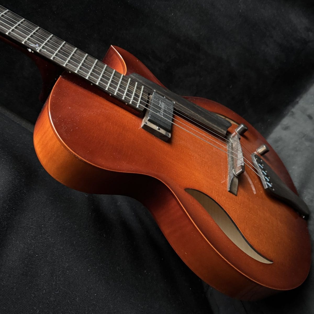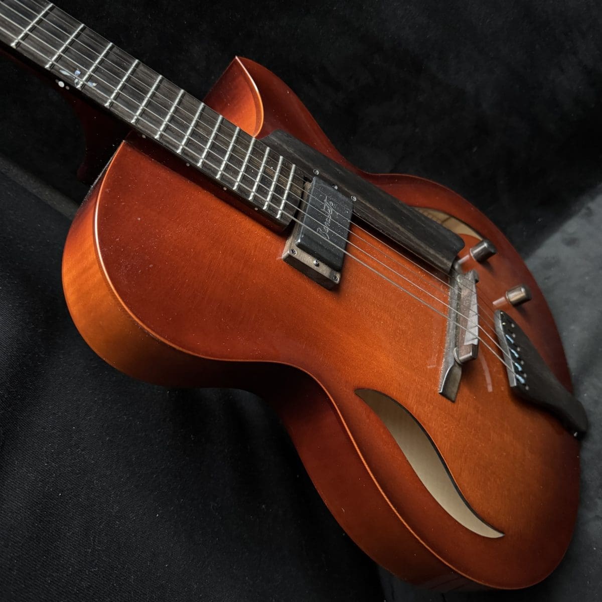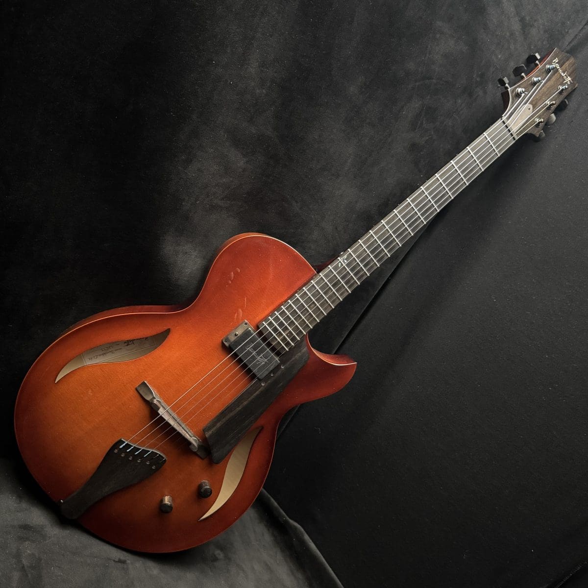 This is a Bambino with a Jazz Attitude…Bambino is a baby in size, but with a big voice. This extraordinary model is a prayer answered for the musician with a lot of time on the road. Its lightweight and compact 14 ½” body is easily manageable in airport traffic or taxis. It features a all solid woods, carved spruce to, Carved Maple back and sides, a maple neck shaped for playing comfort as only a Benedetto can be. Only one Benedetto A–6 pickup, it’s all you’ll ever need! So, if you’re looking for the tone of a big jazz box but need the compact comfort of a smaller guitar, this model was made for you. with only a single pickup placed in the rhythm position. Also custom Fret inlays and original case