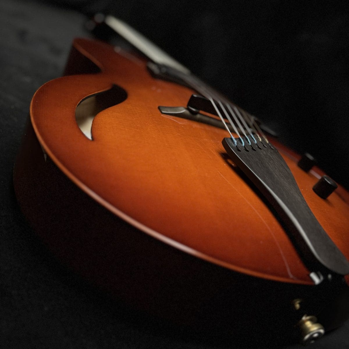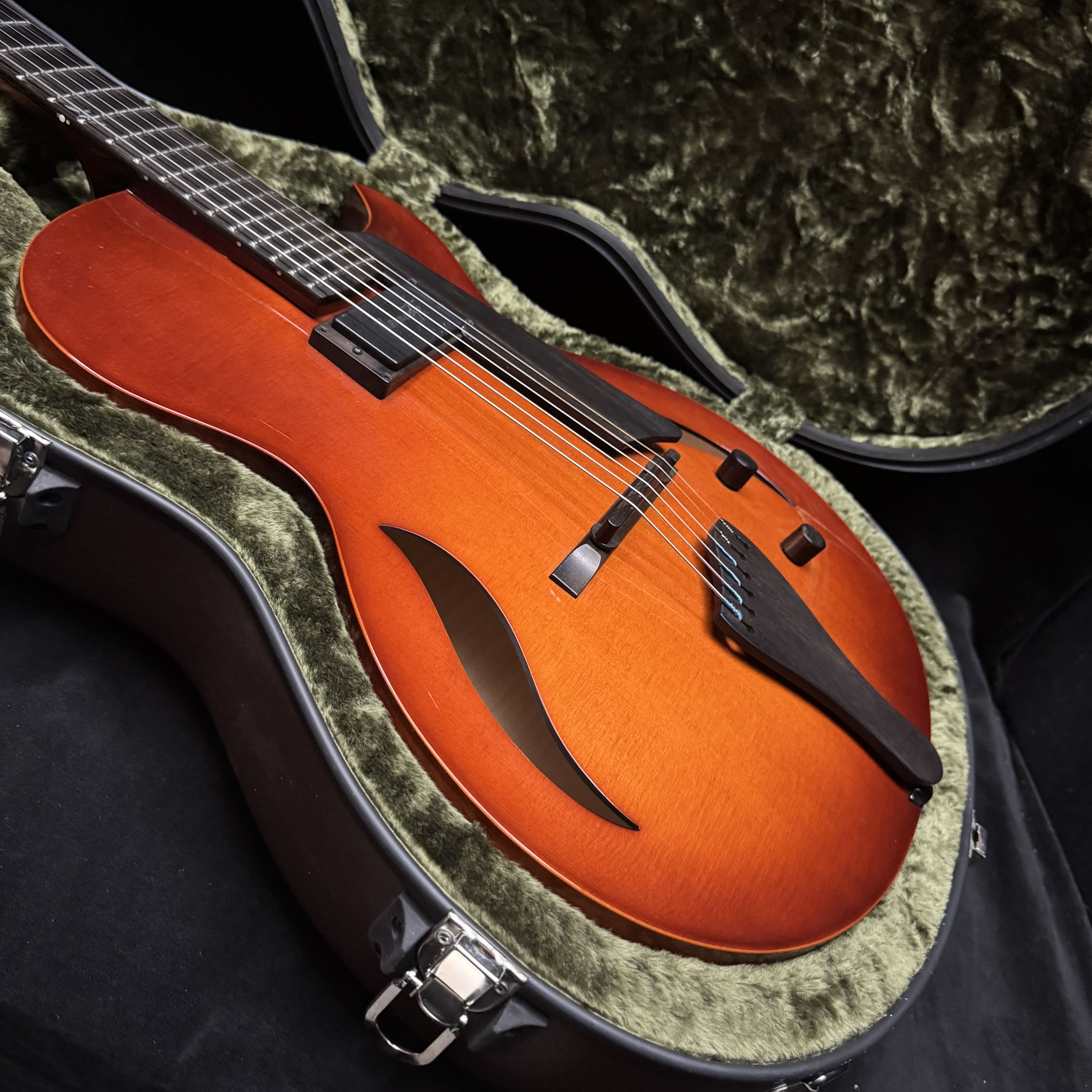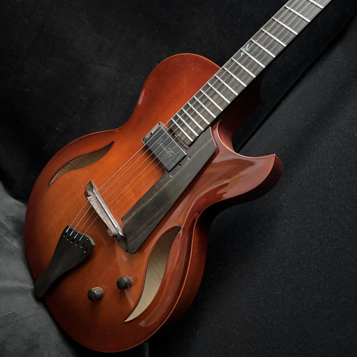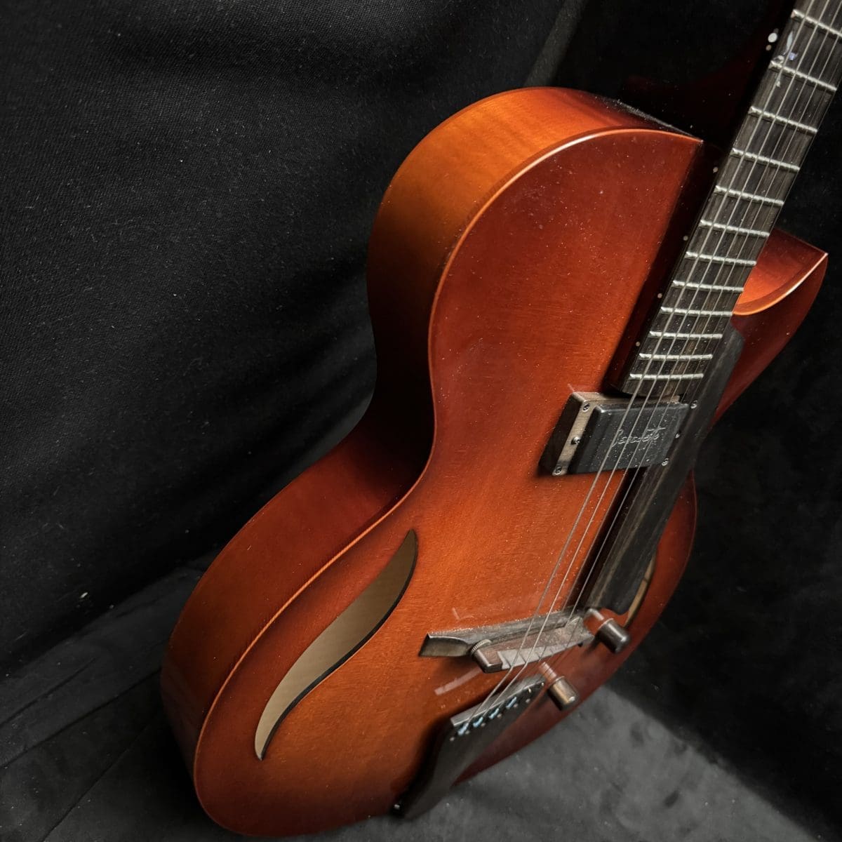 This is a Bambino with a Jazz Attitude…Bambino is a baby in size, but with a big voice. This extraordinary model is a prayer answered for the musician with a lot of time on the road. Its lightweight and compact 14 ½” body is easily manageable in airport traffic or taxis. It features a all solid woods, carved spruce to, Carved Maple back and sides, a maple neck shaped for playing comfort as only a Benedetto can be. Only one Benedetto A–6 pickup, it’s all you’ll ever need! So, if you’re looking for the tone of a big jazz box but need the compact comfort of a smaller guitar, this model was made for you. with only a single pickup placed in the rhythm position. Also custom Fret inlays and original case